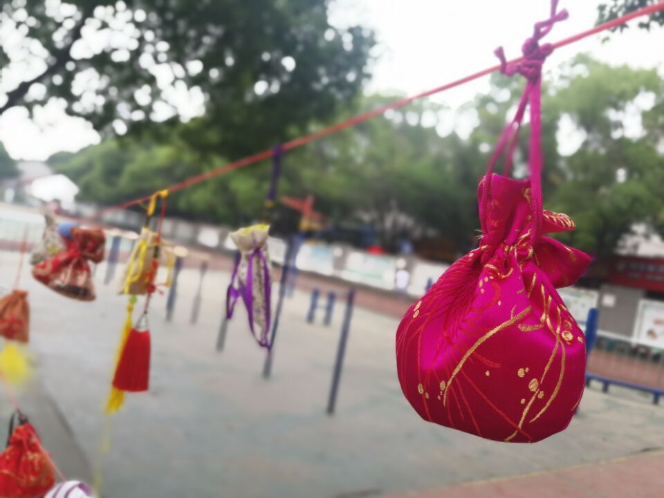 高年级的男孩们变成巧手郎,女孩们成了小织娘。他们或带好半成品,或带着家中废弃的雨伞布、旧衣物,穿针引线中,一个个漂亮的香囊雏形渐成。孩子们还在其中加上了各类花草,薰衣草、茉莉花、艾草。顿时,教室里弥漫着一股浓浓的药草香,更见一个个精致的小香囊呈现眼前。彩色丝线间,传递着浓浓的民俗文化。