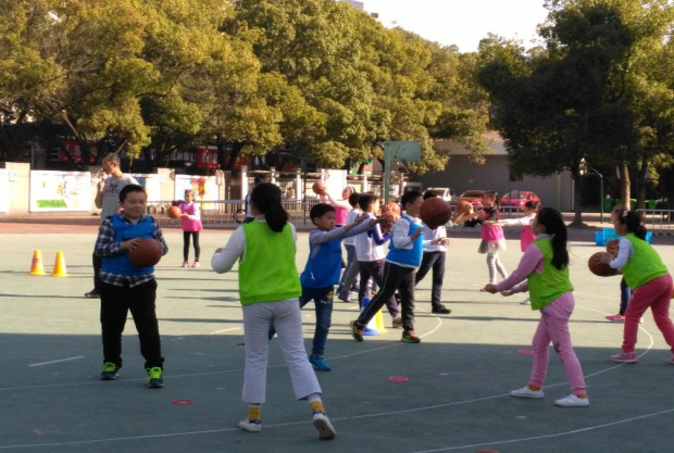 下午,钱亢老师执教四年级《篮球双手胸前传接球》,他设计圆形场地,创设“战狼”情境,以“与不同的同伴传球”为突破点,打破常规分组的方式,通过双人练习、4人换位传球、12人换位传球和全班的换位传球,不断让学生轮换合作对象,从而检验所学技术,发展合作能力。钱老师善于捕捉课堂资源,不断激励学生,在游戏和比赛中教授技术,场地与队形的变化相得益彰,学生学在其中、乐在其中。