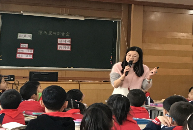 金玉老师带领二(1)班的同学们走进诗歌世界,她选择了《雪》、《雨铃铛》、《巴喳巴喳》等带有拟声词的儿歌,通过找诗句、找词语、想画面等方法,把孩子们带入平等、创造、开放的对话交流中,真正做到了提供语场,让对话有源头,互动有本。孩子们跟着金老师愉悦地聆听“诗园里的百音盒”,“沙沙”,孩子们读得那样轻柔;“丁零当啷”,孩子们读得如此清脆……在场近五十个听课老师沉醉其间,赞叹金玉老师灵动的课堂,佩服孩子们丰富的想象。