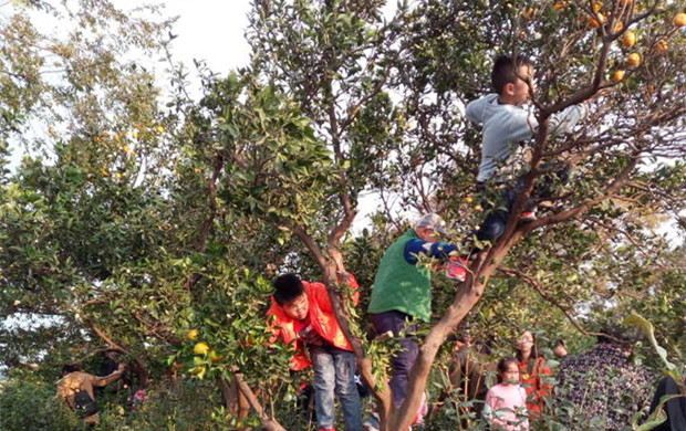 最令孩子们欢呼的要数下午的采桔子了。走进桔园,一棵棵桔树上挂满了黄澄澄的桔子,大人孩子都迫不及待了,采一个,先尝尝,恩!不错,甜中略带一丝酸味,这才是最新鲜,最纯真的原生态桔子味。检验完毕,大家就开始行动了。看!那个小家伙真如小猴般机灵,一骨碌就爬到了树顶。那个爸爸,个子高,伸个手就够到桔子了。还有那个妈妈,也毫不逊色,在儿子的鼓励下,也爬上了树枝,左手一只,右手一只,采的不亦乐乎耶!一阵忙乱之后,大家个个满载而归,沐浴着夕阳的余晖,我们再次踏上了回家的旅程!一路欢笑,一路高歌,今天真的好开心!(费银芬)
