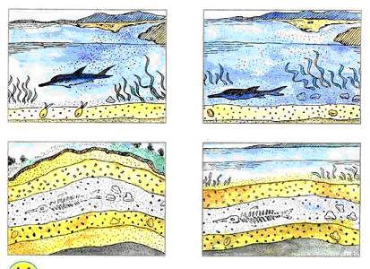 推测一:根据下列四幅图的演示,你能推测一下:鱼化石是怎样形成的吗?