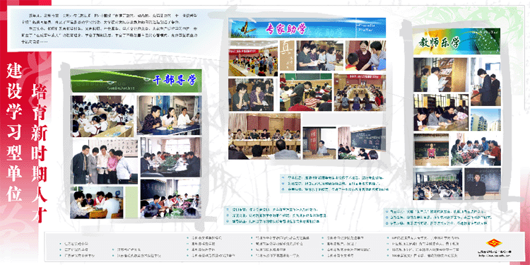 根据《关于建设学习型单位展板征集和评比的通知》(常教宣〔2003〕5号)精神,受到表彰的建设学习型系统工作先进单位,都围绕学习型单位主题精心制作了图文并茂、特色鲜明的展板。市教委经过认真评比,共评出一等奖2个、二等奖4个、三等奖6个、优秀奖15个。我校送评的《建设学习型单位,培育新时期人才》展板荣获一等奖。