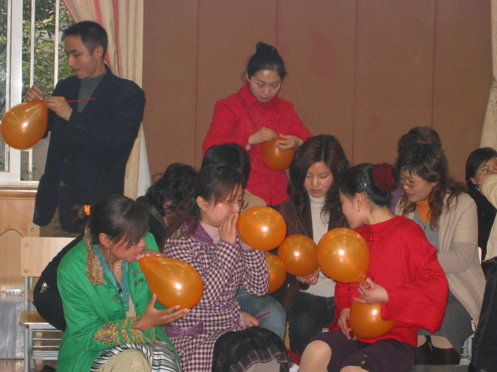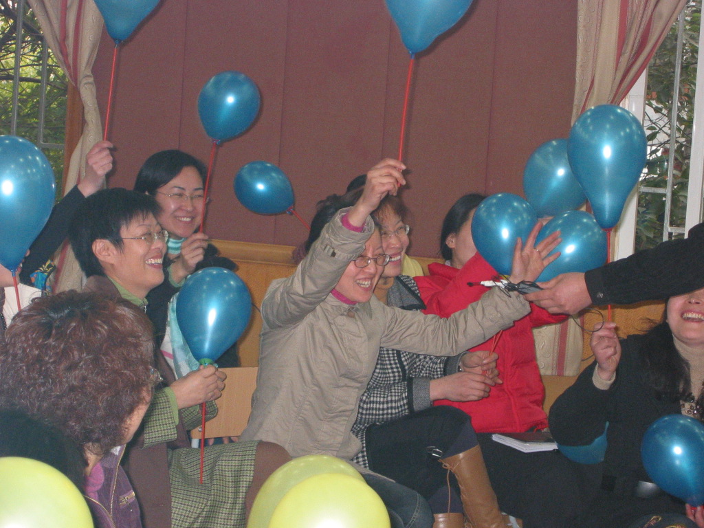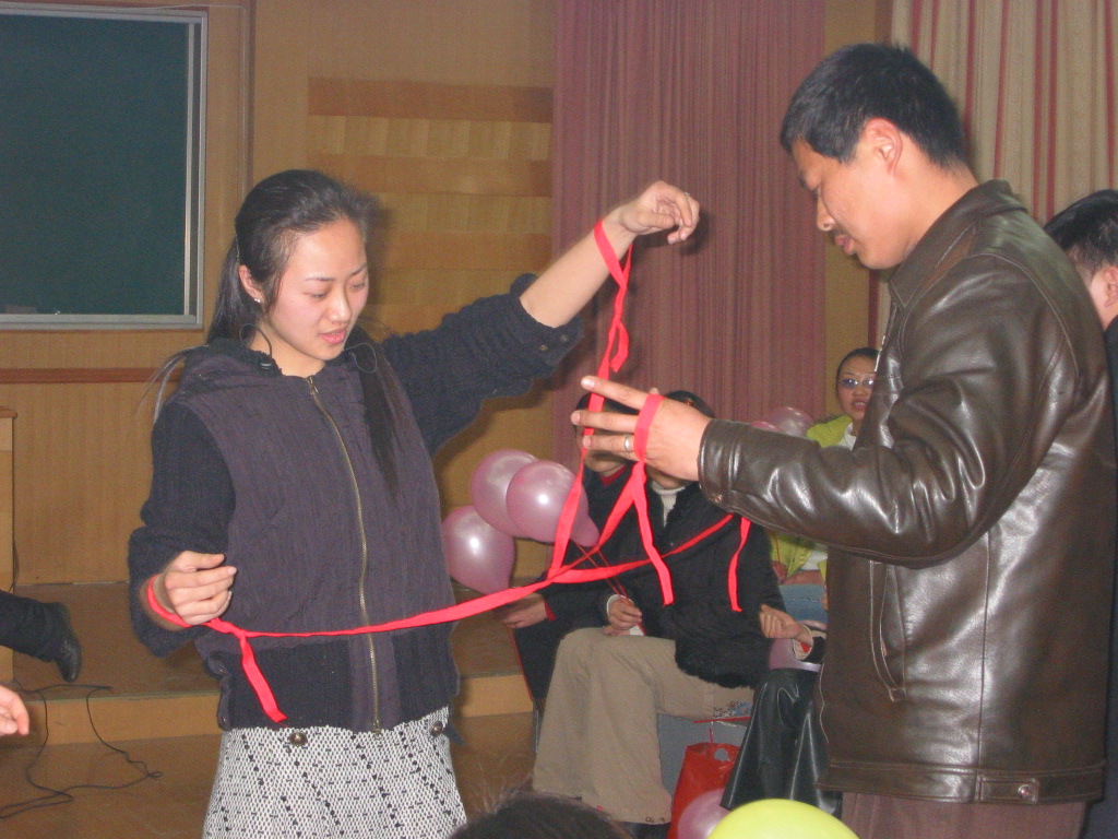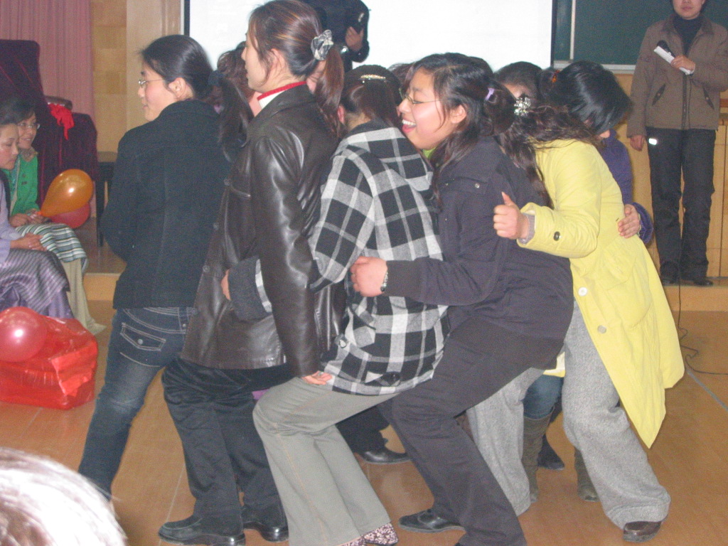 说它特殊,是因为它不仅是一次“三八”节的庆祝活动,还是一次有着七位“寿星”(生日均在3月份)的集体生日。或许是一种巧合,七位“寿星”中,女教师刘娜佳的生日正好在3月8日,男教师郦少春的生日正好在3月9日。学校党支部和工会及时捕捉资源,策划了一次别开生面的“双庆”活动。将全校老师分成若干组,邀请 七位“寿星”做“家长”,用抽签的方法将老师们领回自己的小“家”,七种不同颜色的气球既是七个“家庭”的标志,也是生活丰富多彩的象征。在“家长”的带领下,家庭成员吹气球,想口号……齐心协力迎接各种游戏和比赛的考验。