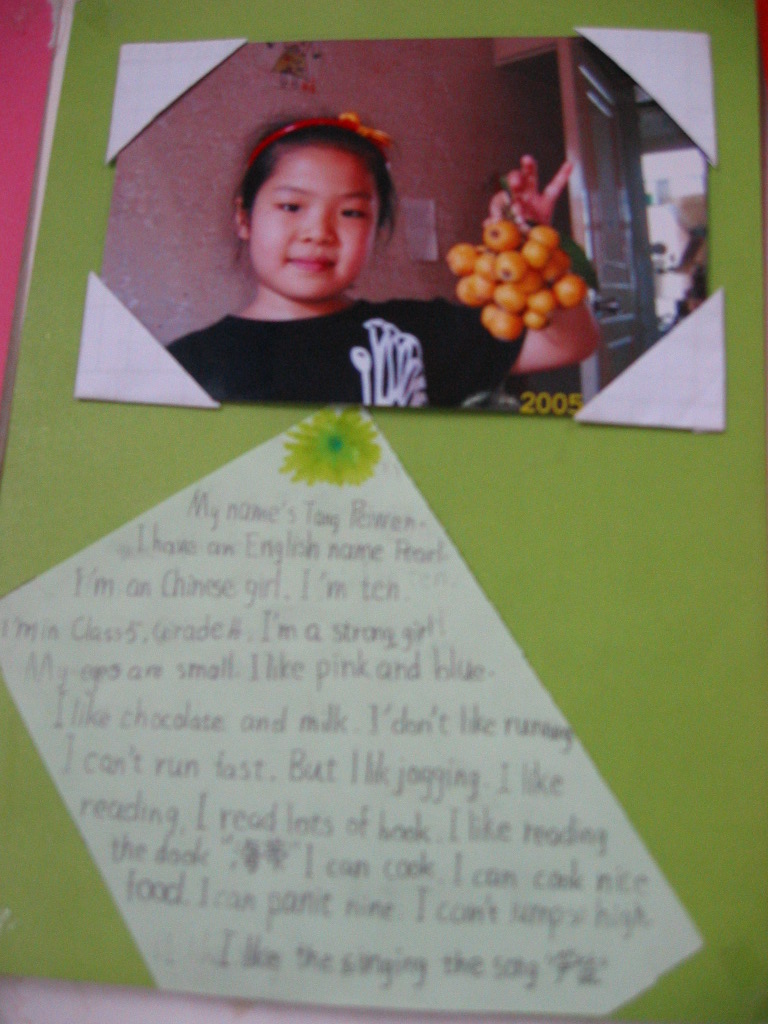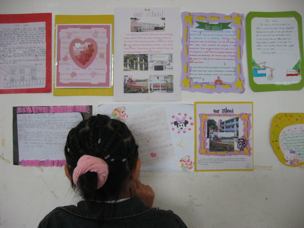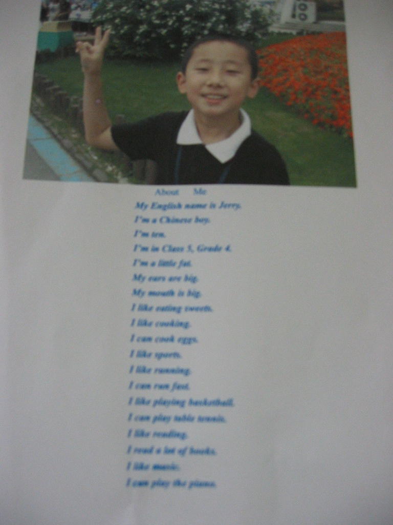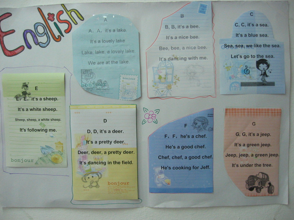 在市教研室胡澄宜老师的倡导下,我们的教室英语环境布置不仅仅追求视觉上的良好效果,而是将环境布置与学生的年龄特点、学习需求紧密结合起来,环境布置有了明确的主题,各年级之间形成了递进发展的系列。如:三年级最近在学习字母,各个教室的墙上就有一些相关的字母儿歌,学生课间可以读读琅琅上口的儿歌,对培养他们的语感、增强他们的记忆力起到了很好的辅助作用;四年级学生最近在学习自我介绍(上海牛津英语),他们教室的墙上就贴着每个人的照片以及他们自己用英语写的一大段自我介绍,看着一张张可爱的笑脸,别说老师更加喜欢他们,他们自己也倍感自豪;五年级学生最近在学习介绍场所的有关内容,让他们画画、写写自己的学校,他们也是非常乐意的,从他们的英文描述可以看出他们对校园的热爱之情;六年级学生正在学习认识、谈论某些公共标志,他们的教室墙上就帖上他们自己收集来的一些生活中常见的标志,英语学习让他们学会关注生活,并遵守相关公共规则。相信随着学习内容的变化,英语墙报的主题和内容也将有相应的改变,但不变的是对学生学习需求的关注和学生自主能力的发展。
