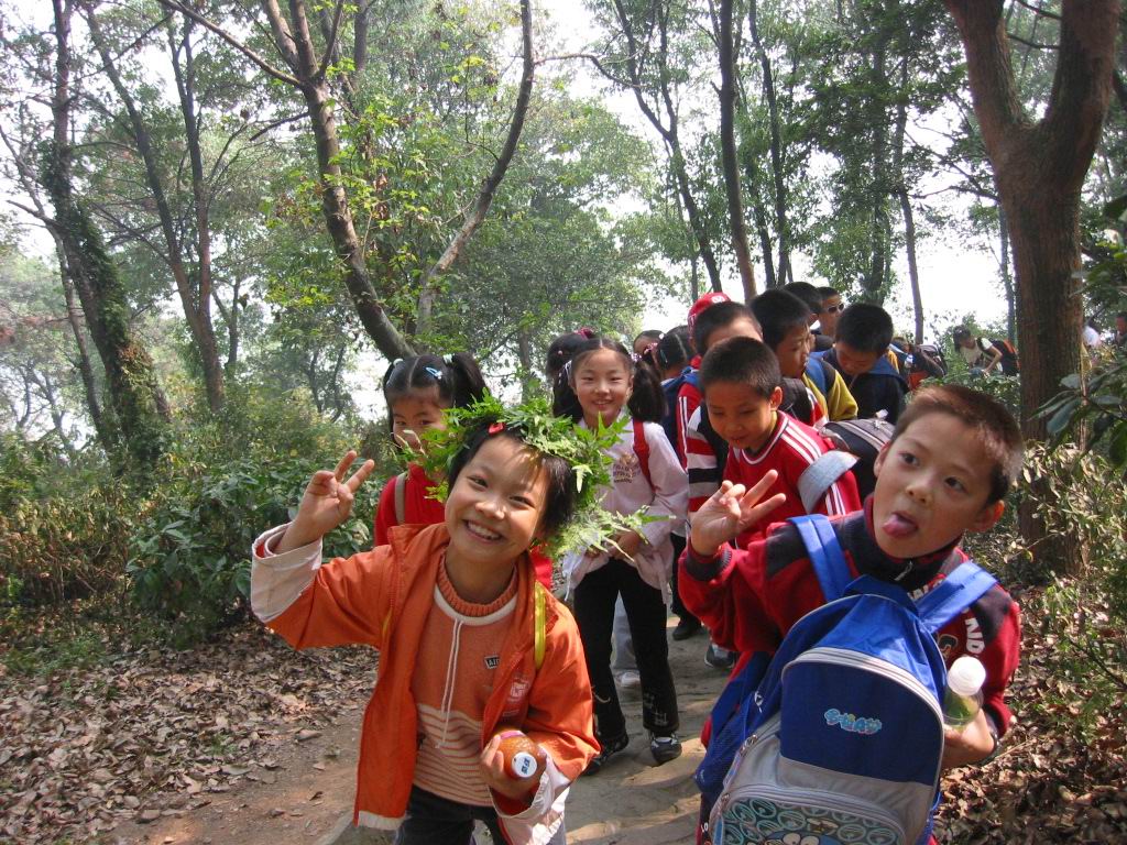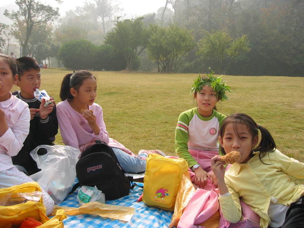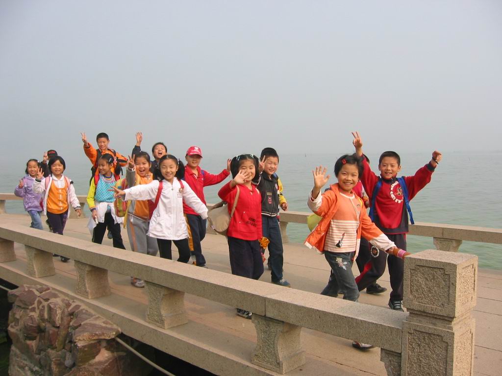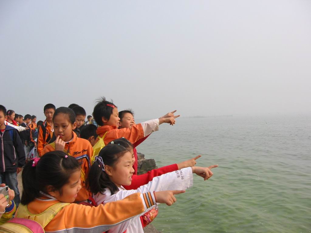 一个多小时的车程,怀揣着无比的兴奋,穿行在弥漫的大雾中,孩子们一路欢歌。不知不觉间,一望无际、波光粼粼的太湖便展现在眼前了,那是孩子们到达了此行的第一站——太湖龙头渚风景区。雾霭中的太湖依傍着龙头小山,如同一位娇羞的美人蒙上了面纱。远处,水光接天,朦胧中分不清哪是天哪是水,隐约有几只小渔船飘荡在湖面上,引得孩子们不住好奇地翘首遥望、指指点点。近处,湖水微微荡漾,穿过薄雾的点点阳光轻轻洒在湖面上,像碎金、似龙鳞,又仿佛无数金色的小精灵在水晶波纹上舞蹈、跳跃。眼前的景象,加上耳边湖水轻拍岸边岩石发出的声响,孩子们心醉神迷了。“太美了,真是太美了!” 此时,除了一声声情不自禁的感叹,找不到任何语言来描绘尽这眼前的一番胜景。来不及收回贪婪的目光,孩子们的小脚丫又攀上了层层石阶,要去往小山高处一睹“龙头”的神威。辛苦地走完一段曲折起伏的山路,却听到导游遗憾地告诉大家:“今天因为雾大,龙头藏在雾里看不清楚。”尽管这样,孩子们却并不失望,沿途那些跳过脚背的的小蚱蜢,那些不知名的花儿、草儿,哪怕是一颗小石子都能唤起他们强烈的兴趣,没完没了的“为什么”,非把老师们考倒不可。草地上的野餐更是一场盛宴,把欢乐、沸腾的气氛掀到了顶点。