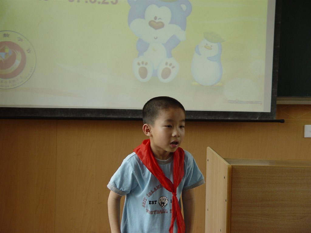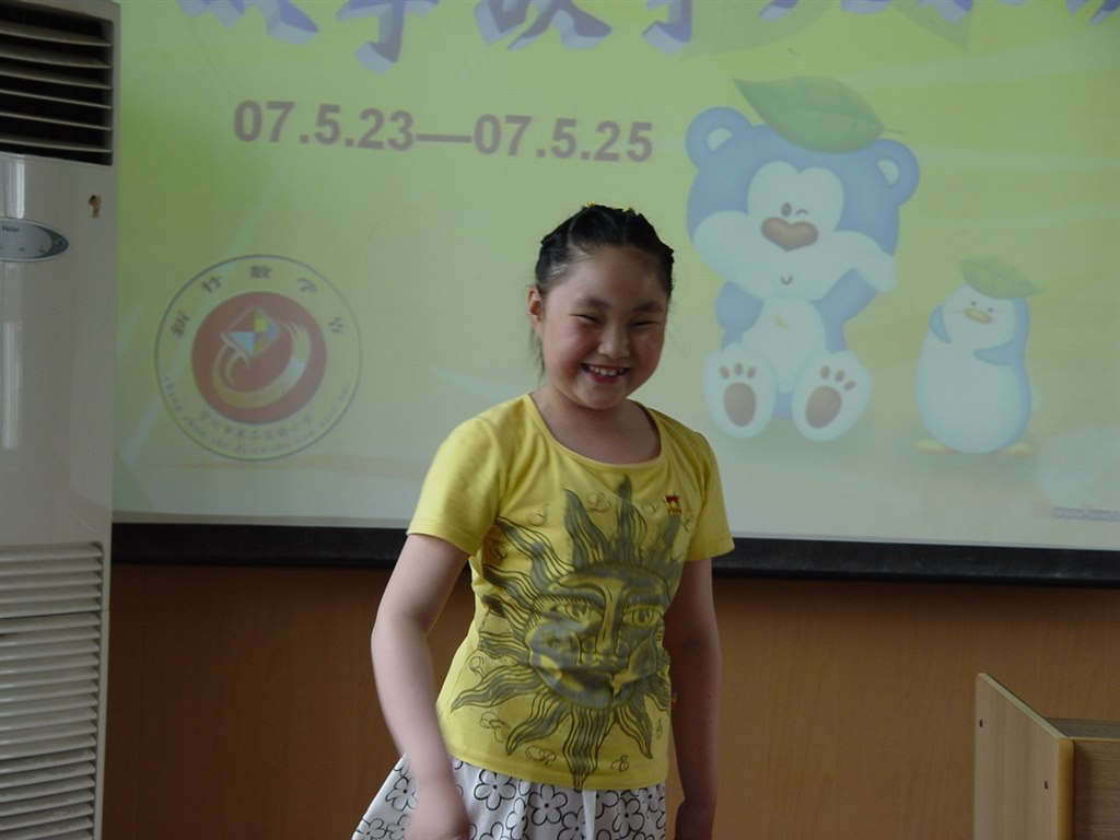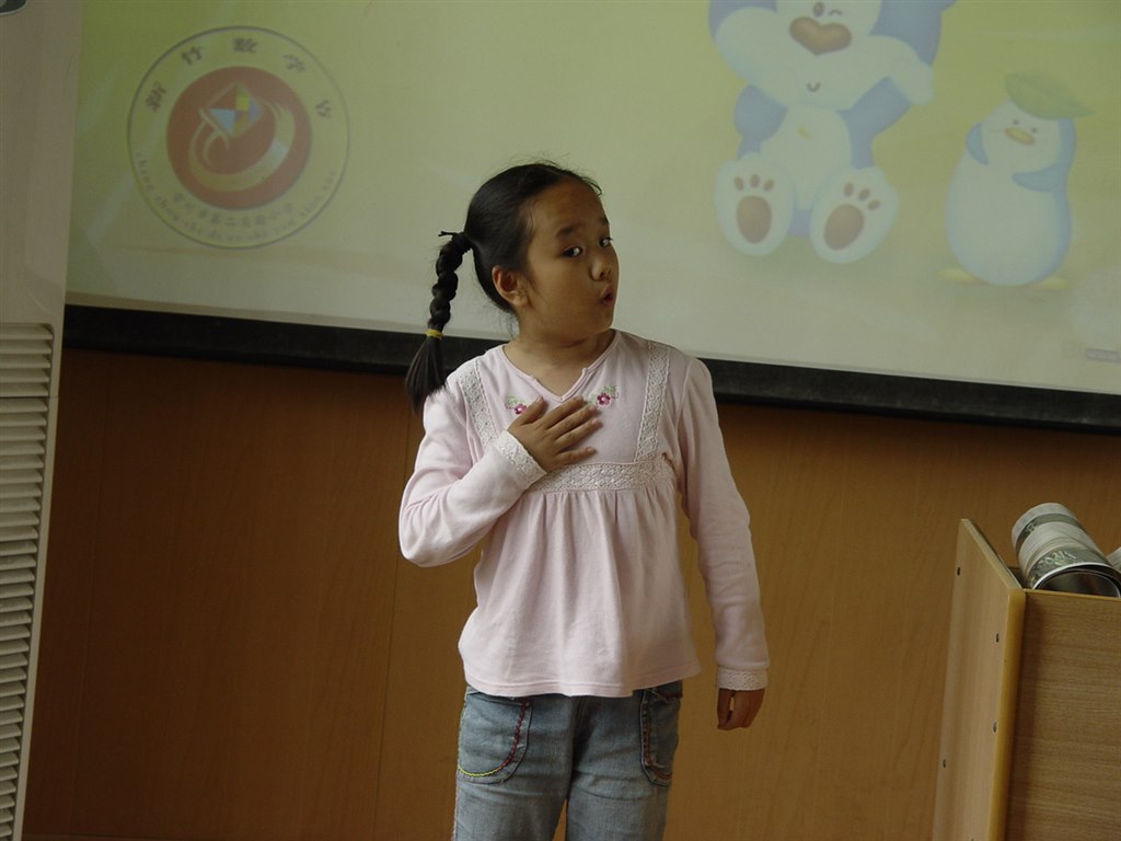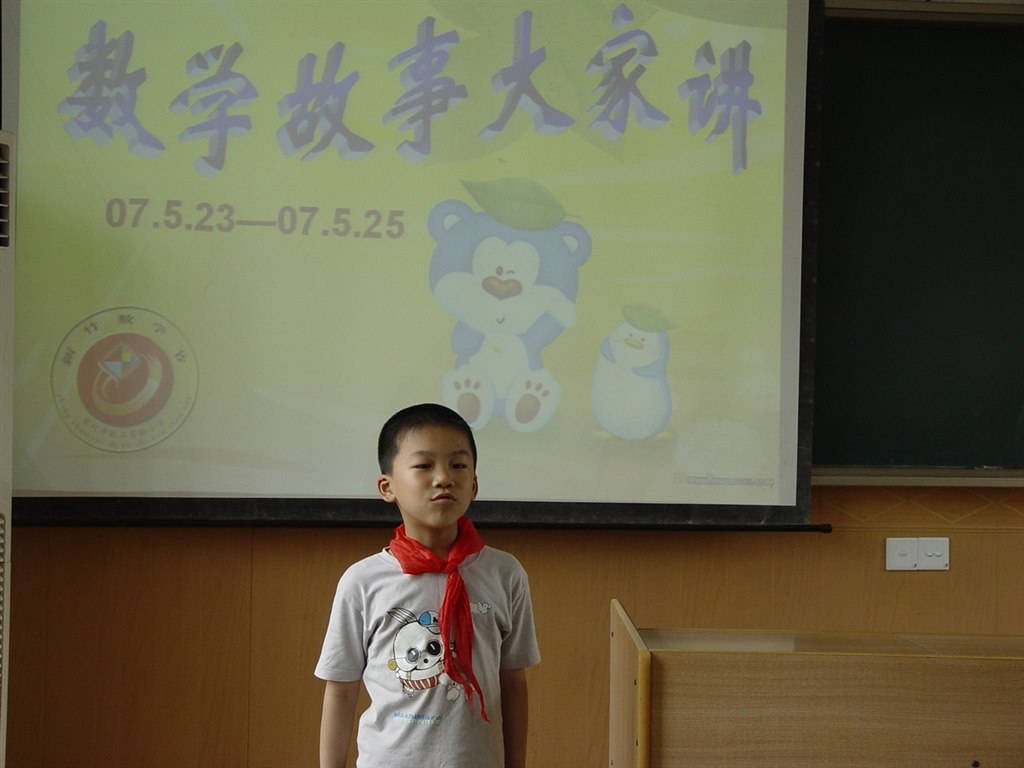 这些一、二年级的小不点们虽然充满稚气,但他们落落大方,神态自然,毫不怯场,甚至有个小选手等不及主持人介绍,便自己跑上台去表演起来了!他们表情生动,把故事演绎得惟妙惟肖:看他们时而大笑,时而皱眉,一会是小姑娘,一会是老奶奶,一会是小熊,一会又成了狐狸。他们的故事取材广泛,又在浅显的故事中为我们展现了经典的数学奥秘: “朝三暮四”的故事引我们探究成语与数学间的联系;“0是怎么来的”为我们讲述了一段数学史话;“华罗庚的故事”激励我们这些家乡后代努力奋进;“小松鼠的星期天”中运用的可是统筹方法这一深奥原理;而“梦游零王国”则在跷跷板游戏中解释了零的性质……