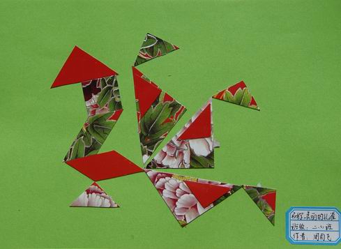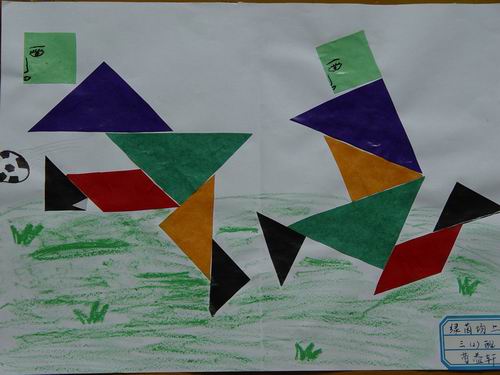 这次活动中,低年段的孩子巧思、动手,创意飞扬,浓浓童趣弥漫了整个校园,谁曾想抽象单调的七块板能变幻出如此多姿多彩的世界呢?阳光下,一幅幅作品中跳跃着的就是那孩子们一颗颗七彩的心啊!