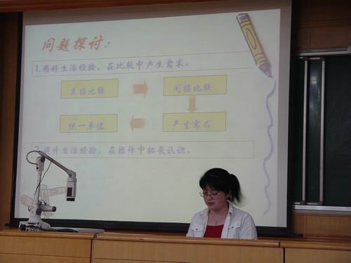 6月5日下午4∶00,全体数学老师集中在多功能教室,一起观看了数学教学网上李新老师的录象课《面积单位》。不管是年轻的选手还是已过参赛年龄的评委,都投入地欣赏着、思考着……