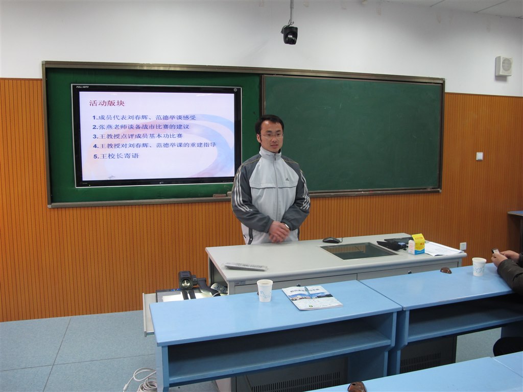 2013年伊始,体育学科是第一个参加区基本功大赛,集团体育组张绍光、刘春辉、范德举、闫萍萍、石成龙五位青年教师积极报名,虽然时间比较紧张,面对大赛表现了积极的心态。了解比赛规则,规则就是准绳,“懂就是懂,不懂就要研究到懂”,读懂规则就是要让选手“了然于胸,完全掌控”。预备会上,王校长帮助青年教师分析自己的优势,根据自己的专业特点,“强项更强,弱项补上”;叶校长帮助他们发现和“挖掘”自己的“最近发展区”;朱校长一边帮着点评演讲,一边激发着五位青年教师专业自觉和比赛的自信心。集团体育教研组与集团钱亢名师工作室携手联合,对照大赛规则,为选手们精心准备“培训风暴”,有目标、有计划、有步骤地培训,让选手胸有成竹、信心满满地走向赛场。