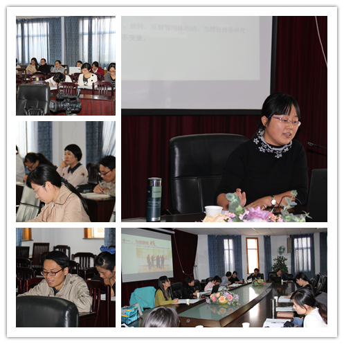 第二个环节是本次工作室活动的一个创新。将工作室原来“主题交流”的环节进行了改革,变为不少于40分钟的微讲座。本次由荆亚琴老师以课为例做了题为《结构教学视野下图形与几何的实践与思考》的微讲座。荆老师围绕“为什么要把空间与图形修改为图形与几何,“小学数学中的几何学知识”,“小学形概念的整体结构及数学教材中的图形与几何知识的框架”,“图形与几何课型的过程结构及其育人价值”,“苏教版2013版的修改之处”,“历届省测题中的图形与几何相关知识”等六个方面讲述了自己对图形与几何这一领域的理解。尤其是利用中美教材对《认识平行四边形和梯形》一课的编排比较,激发了每一个参与者的思考。