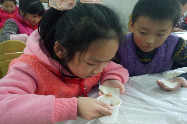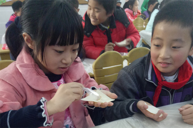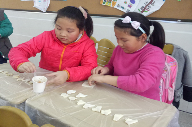 包馄饨的工具很是齐全,叉子、勺子、便当盒、蒸锅、作料袋……齐上阵,教室里还搭起了临时灶台。每个学生都领到一个盛着肉馅的纸杯子和与肉馅分量刚好匹配的小馄饨皮,每个孩子还领到盛着紫菜、鸡精、盐等香料的碗。有的同学闻着香味扑鼻的调料,忍不住开吃了一口,大赞其鲜美。只见潘奇妈妈一一分解示范包馄饨的步骤:首先,把已经调味好的肉馅用勺子挖出来一小坨,接着把馅涂抹到正方形的小馄饨皮上,然后用力把馅周围的皮包起来,裹紧实,一个白白胖胖的小馄饨便成形了。同学们安静地听完示范,便迫不及待地小试身手。