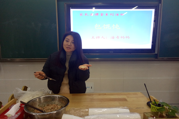 阳光明媚的下午,紫云小学三2班的教室里飘出了阵阵香味,一片热火朝天、其乐融融的大餐场面引人驻足观看:呵!原来是潘奇妈妈进课堂教孩子们包馄饨呐!