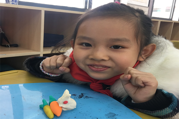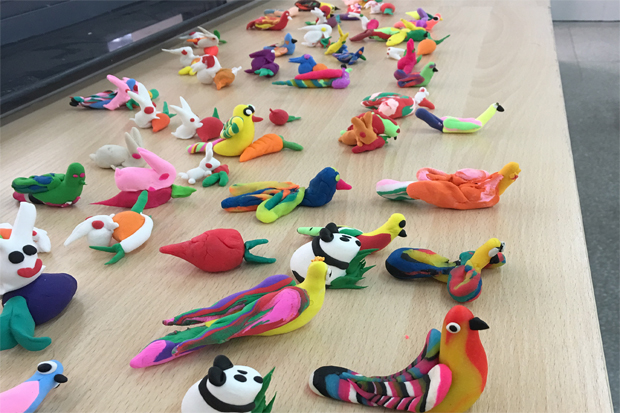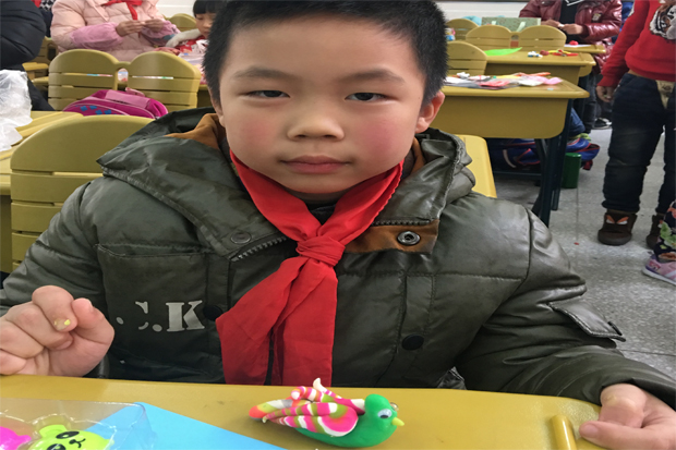 了解完捏泥人文化,同学们已经跃跃欲试了,董梦瑶的爸爸开始大显身手带领学生做起了小兔吃萝卜。他边做示范边讲解,只见他拿起一团泥,先捏成圆形,再用手轻轻揉搓,使它变得柔软起来,光滑起来。接着,又在上面揉搓,再用剪刀在各处一剪,诶,一个栩栩如生的小白兔就完成了!小朋友们在指导下一一动手做了起来,有的还发挥想象力给小白兔做了花纹呢!董梦瑶的爸爸一一走到学生座位前悉心指导着,同学们听得格外认真,有的同学甚至直接走到讲台前对制作的细节再三进行询问。看着同学们这么积极热情,董梦瑶的爸爸又教大家制作可爱的彩色小鸟。