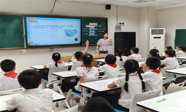 唐琳老师执教《植树问题》。课堂伊始,唐老师引导学生观察生活中的“间隔”现象,引出“间隔”概念。接着,唐老师创设了“植树问题”情境,引导学生探究两端都栽、只栽一端、两端都不栽这三种情况下棵数与间隔数的关系。学生在画一画、算一算、比一比的过程中,掌握数学方法。练习中,孩子们还探究环形与方形的“植树问题”,在解决问题过程中运用数形结合思想,建构数学模型。