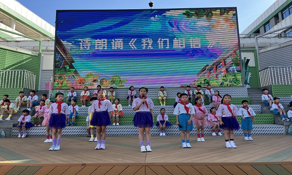 四(7)中队全体队员登台表演诗朗诵《我们相信》。小小的模样,藏着大大的能量,孩子们用铿锵的声音和坚定的眼神,表达出简单的愿望和相信的力量,展现出当代少年特有的自信和勇敢。【节目1】