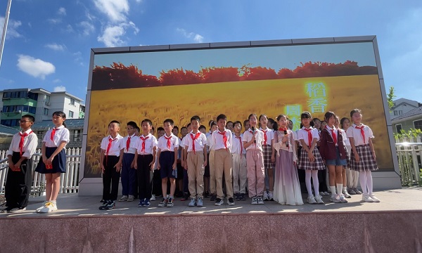 五(5)中队全员表演合唱《稻香》。同学们展现出积极向上、朝气蓬勃的精神状态,将整个升旗仪式的氛围推向高潮。