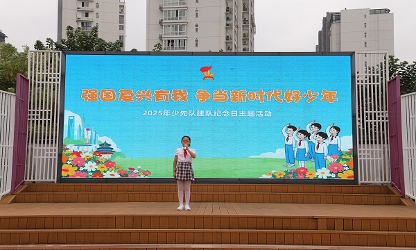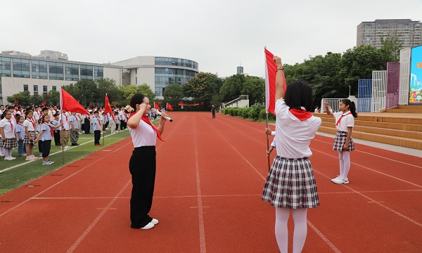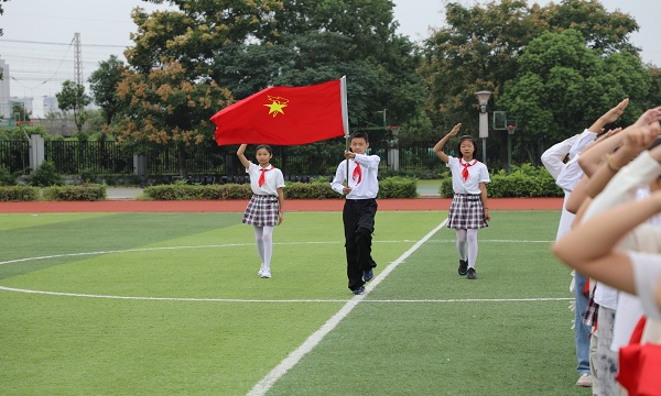 “全体立正,出旗!”随着主持人响亮的口令,三名高年级旗手迈着坚定的步伐,手举鲜红的队旗从队伍前走过。队旗上的五角星与火炬在阳光下闪闪发亮,操场上瞬间安静下来,连风吹过树叶的声音都变得格外清晰。全体同学目光紧紧追随队旗,不少人悄悄挺直了腰板,脸上满是期待。随后,《中国少年先锋队队歌》的旋律响起。“我们是共产主义接班人,继承革命先辈的光荣传统……” 同学们目光如炬,跟着音乐大声歌唱,稚嫩却有力的歌声在校园里回荡,每一个音符都透着激动与自豪。