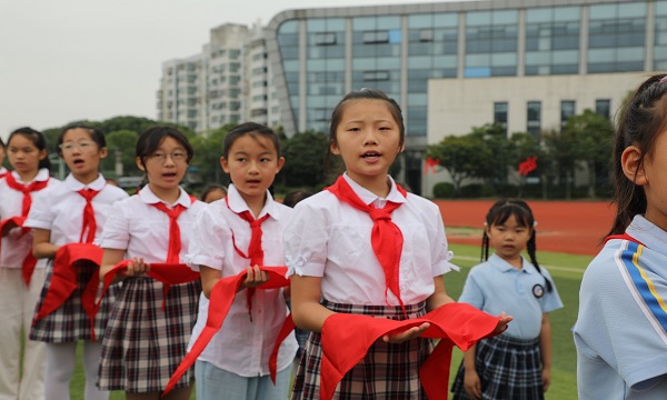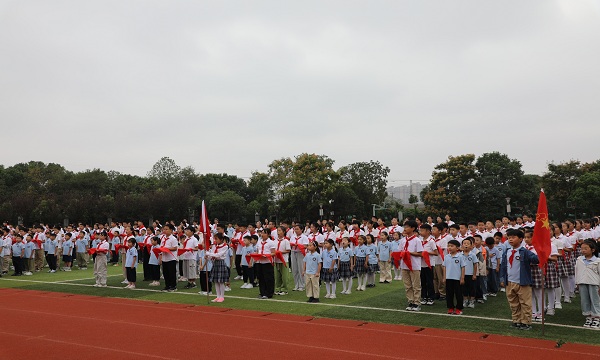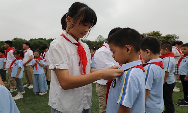最让人期待的“授巾环节”终于到来。五年级的队员们手捧红领巾,快步走到新队员面前。他们小心翼翼地将红领巾披在新队员肩上,认真地系好结,还不忘帮小伙伴把红领巾的边角捋平。新队员感受着少先队员身份的分量,眼中闪烁着自豪和责任。“请新队员举起右拳,跟我宣誓!”在大队辅导员宣馨蕾老师的带领下,新队员们高高举起右手,眼神坚定。每一句誓言都掷地有声,印刻在少先队员们的心里。