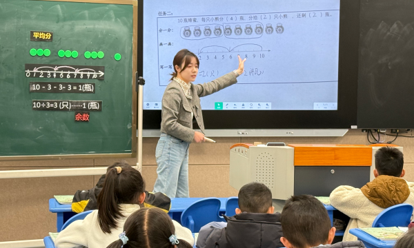 活动伊始,计佳琪老师带来二年级上册《有余数的除法》。课堂以 “熊大熊二森林丰收” 的动画导入,瞬间点燃学生兴趣,围绕“10 瓶蜂蜜如何平均分”的问题,引导学生通过同桌交流、分一分、画一画、数线表征等方式展开探究。从 “正好分完” 的旧知复习,到 “分后有剩余” 的新知探索,计老师循序渐进引导学生感知余数的产生。通过学习单任务驱动,学生自主尝试用算式表示剩余情况,在错误辨析与规范书写中,掌握有余数除法的读写。随后,通过“摆三角形、四边形、五边形” 等实操活动,学生自主发现 “余数一定比除数小” 的核心规律,课堂从具体操作走向抽象思维,充分体现 “做中学” 的教学理念。