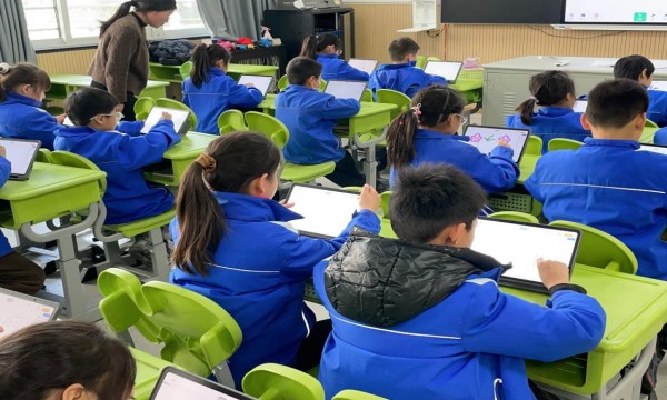 活动伊始,徐诗文老师带来《平移和旋转》课堂展示。本节课以平板为核心教学工具,徐老师通过生活场景视频导入,引导学生在平板上完成运动现象分类、互动练习,结合手势模仿引出核心概念,再以自动门、电风扇等实例讲解平移与旋转特征。练习环节层层递进,先借助 AI 制作的古诗情境视频,挖掘诗句中平移与旋转现象,同步融入地理知识解读地球自转;随后开展美术创作,让学生用平移、旋转方法设计图案;最后引入劳动教育,指导学生制作纸风车,过程中通过平板运用 AI 工具豆包探究旋转原理,实现多学科深度联动。